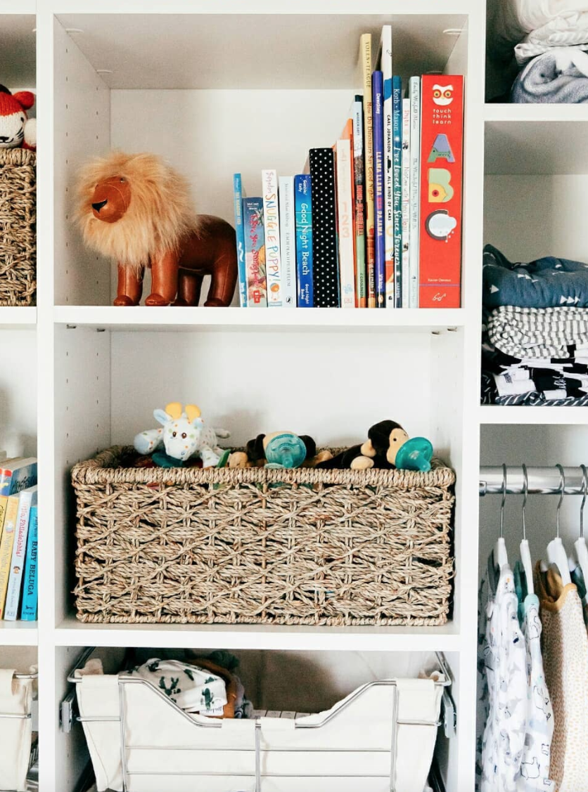 Shelving or cubies in the closet is a great place to display keepsakes or baskets for more storage.