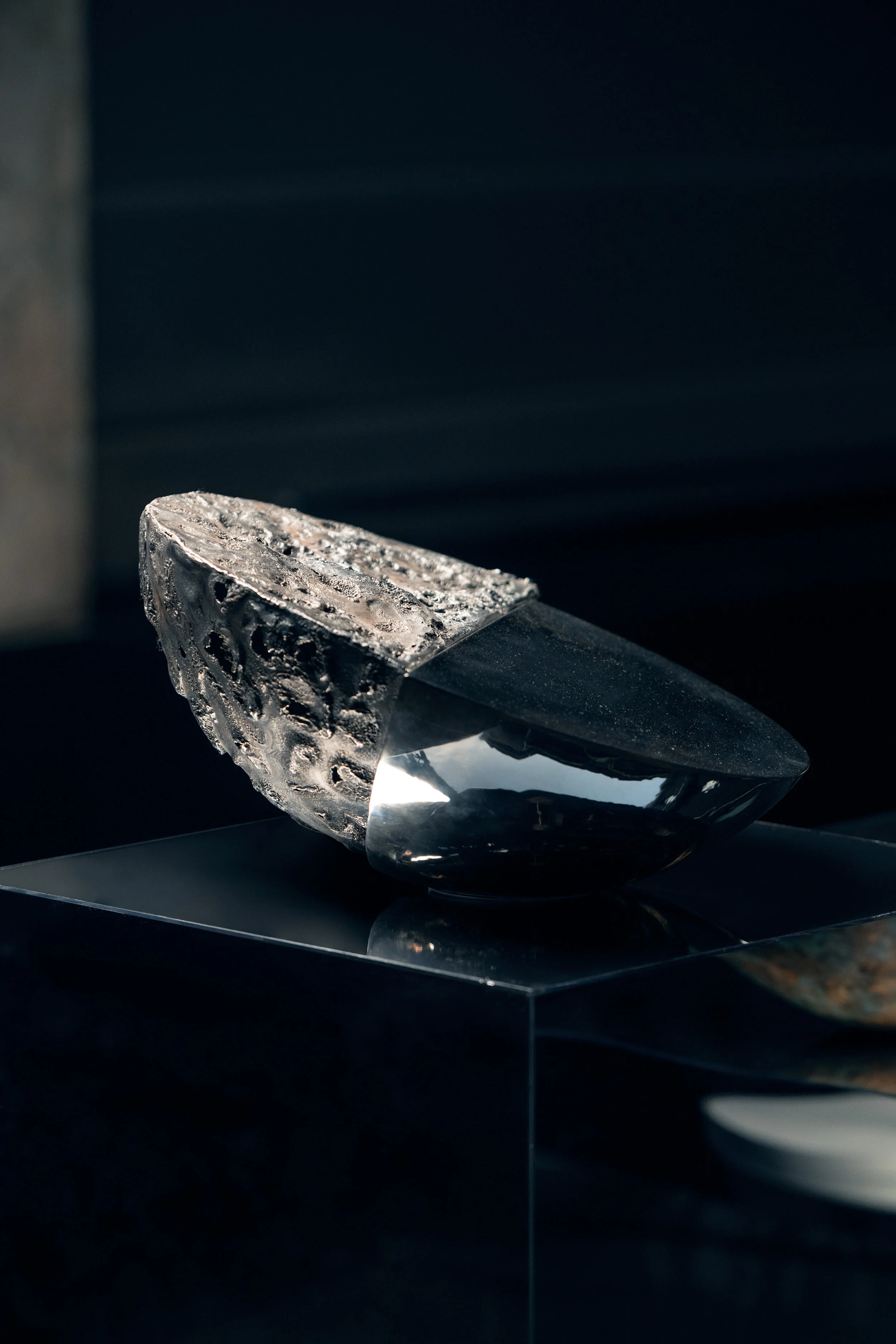 Bespoke sculptures and objects inspired by the theme of water and handmade by Italian artisans rose from the pool—conjuring images of ancient sunken cities now resurrected. A bronze fragmented version of the head of Venus by Fonderia Artistica Ruocco. Metal monoliths by Anna Paola Cibin. A swinging velvet armchair embellished with ostrich feathers by Monica Gasperini.